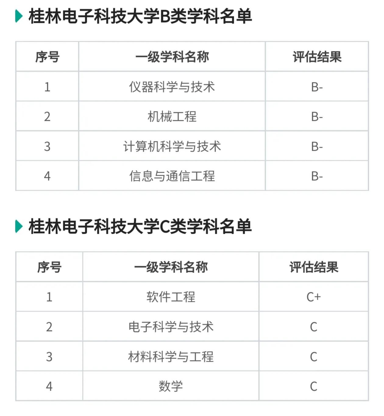 桂林电子科技大学拥有仪器科学与技术、机械工程、计算机科学与技术和信息通信工程4个B级学科,有软件工程、电子科学与技术等4个C级学科。