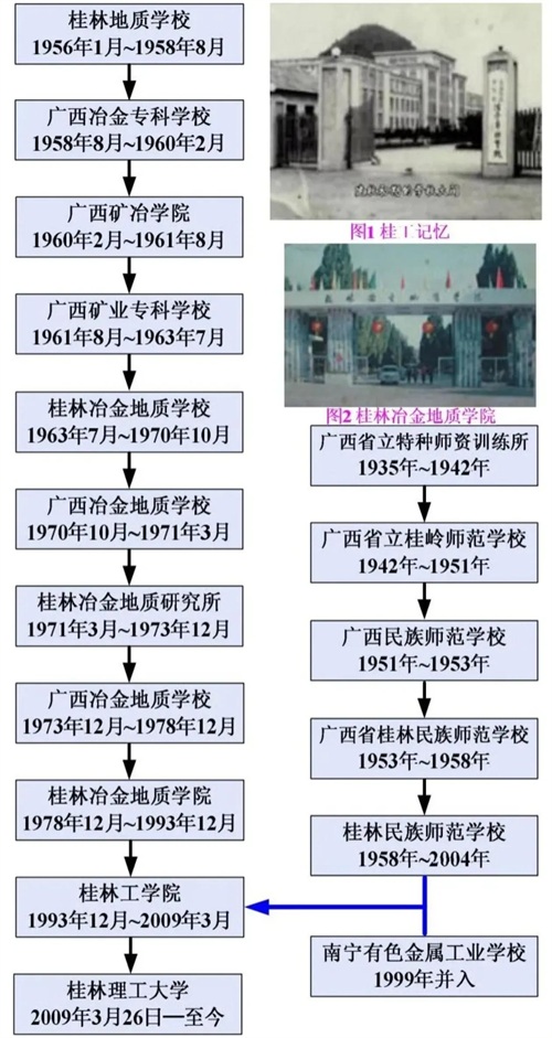 桂林理工大学的前身是桂林地质学校,在1956年,为了响应国家工业化建设的需要,桂林地质学校在桂林成立。1958年,学校更名为广西冶金专科学校,并增设多个专业来适应当时的经济建设需求。到了1978年,学校更名为桂林冶金地质学院,开始本科层次的教育,并且逐步发展成为一所综合性高等学府。在2000年与2004年期间,原南宁有色金属工业学校、桂林民族师范学校先后并入学校,并2009年更名为桂林理工大学。