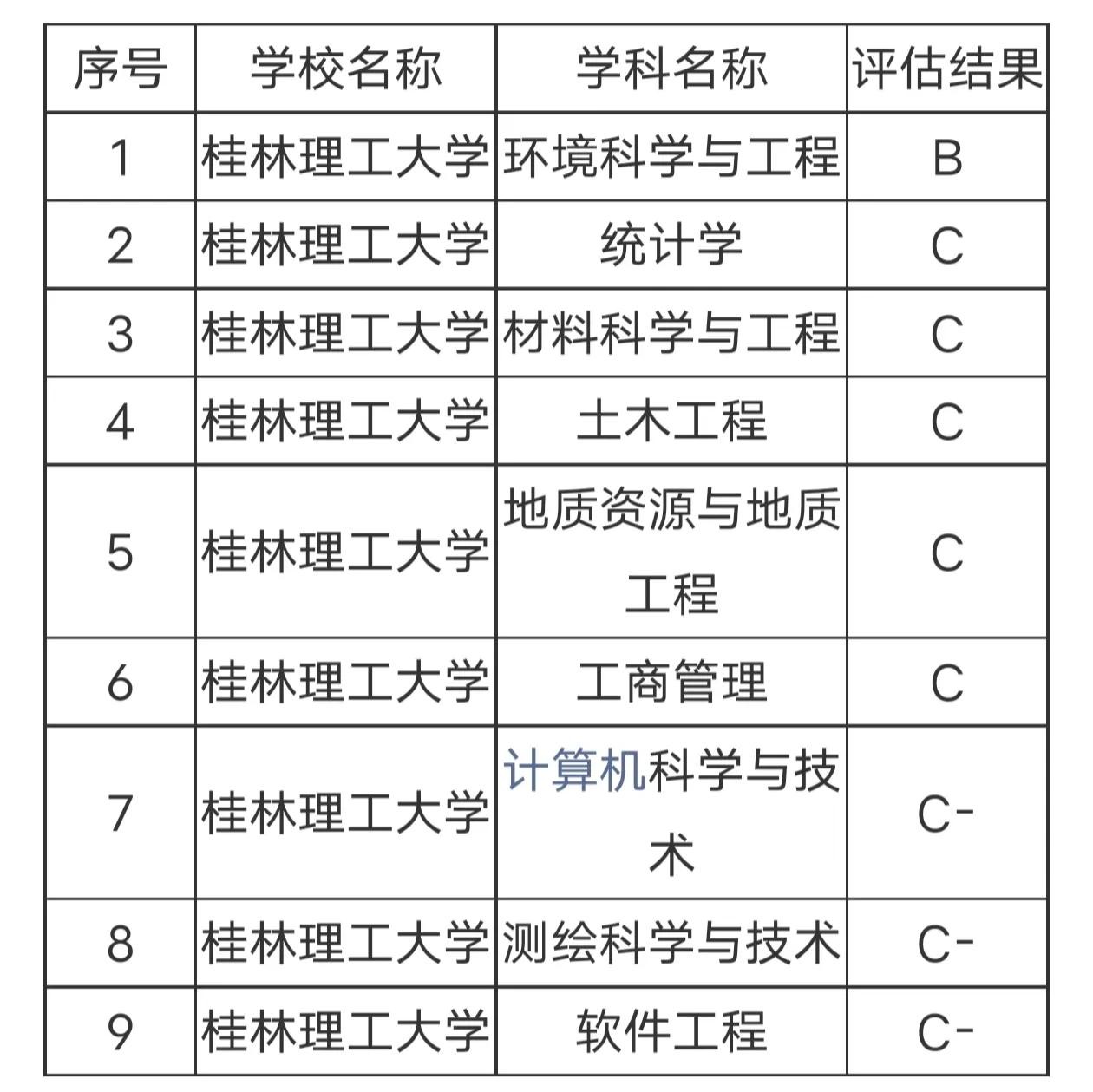 而桂林理工大学只有环境科学与工程一个B级学科,和统计学、材料科学与工程、土木工程等8个C级学科。