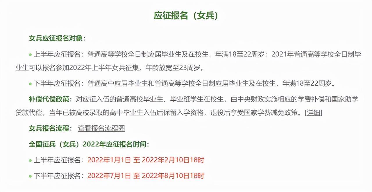 根据规定,男性征兵报名从去年的12月1号就已经开始了,一直到2月10号都可以报名申请。而女兵报名则是稍微晚一点,是从1月1号开始,然后会在2月10号和男兵报名一起结束。