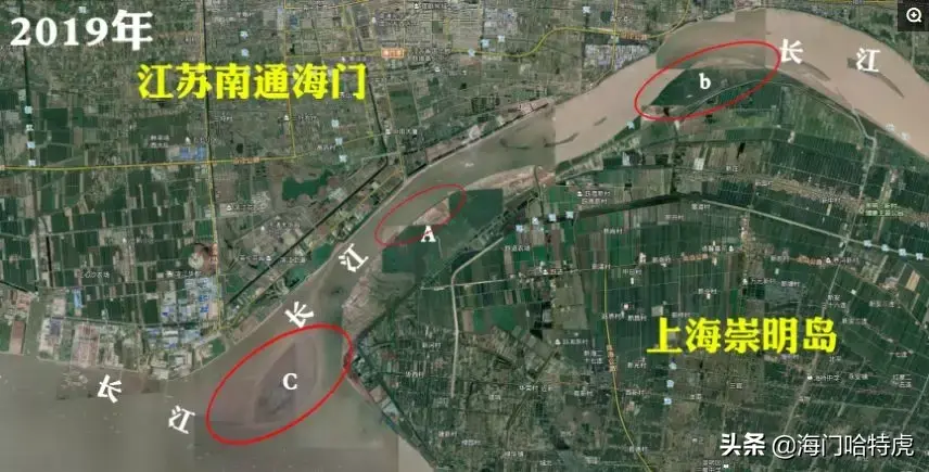到了2019年,除了原有新增土地继续固化扩展,崇明岛西侧犄角与海门港之间的“夹江”入口处再次出现时隐时现的沙岛(图示C地块)。