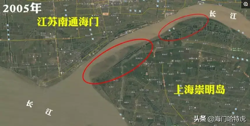 到了2005年,崇明岛的西侧的泥沙大面积囤积,开始出现上千米宽度的泥沙堆积成陆现象,不过也不太稳定,枯水期露出,丰水期又没入江水,此时,海门和崇明岛之间的间隔已经越来越小了。