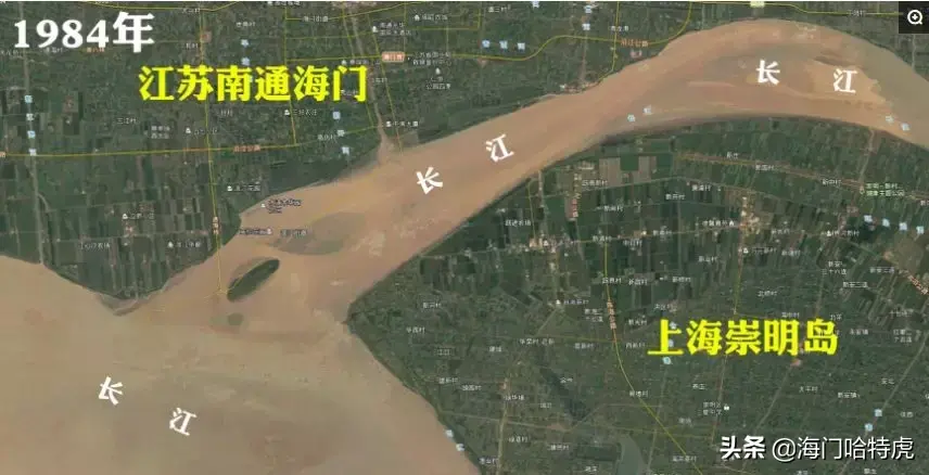 上图为1984年的状况,从这张图我们可以明显的看到,当时处于崇明岛和海门之间的长江(夹江)水道还是比较宽的,大约和现在江阴与靖江之间的长江水道差不多。