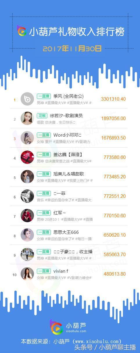 2017微博 #V影响力峰会# 直播最大V评选在昨晚进行20进10的半决赛,此次活动的举办引爆了一直播平台,昨日有九位一直播主播进入礼物收入榜单,男神主播季风 (全民老公)直播间礼物收入330万元,成为当之无愧全网吸金王; Word小邓邓、 盖达巍【薇澄】、 旭美儿&唱甜歌、一菲、红军、思思大王666、子豪,收主播直播间内咨询、 vivian f八位俊男靓女凭借在此次盛典活动优异的表现均进入到榜单前十之中;花椒主播 徐若汐–歌剧演员昨日直播间礼物收入189万元全网第二,打破了一直播对于榜单的垄断地位。