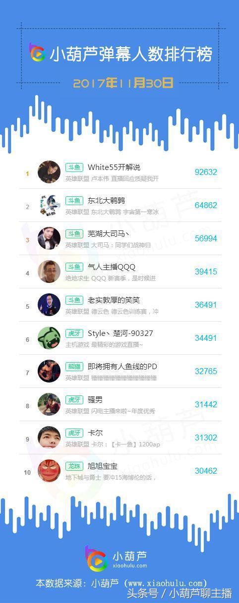 昨日的弹幕人数排行榜上,自带话题属性的斗鱼一哥White55开解说直播间弹幕活跃人数9.2万成为全网弹幕王,成为昨日小葫芦指数榜与弹幕人数双料冠军;东北大鹌鹑、 芜湖大司马丶、老实敦厚的笑笑、气人主播QQQ 直播间弹幕人数均超过3.6万,分别位居榜单第二、第三、第四、第五位;虎牙铁三角Style丶楚河-90327、骚男、卡尔依靠在各自游戏领域取得的卓越成就均跻身昨日榜单之中;熊猫主播即将拥有人鱼线的PDD于龙珠DNF一哥旭旭宝宝昨日排名第七、第十位成为各自平台唯一入榜主播。