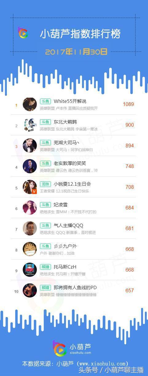在昨日小葫芦指数排行榜上,连续吃鸡29把却深陷外挂风波的斗鱼一哥White55开解说小葫芦指数1089全网首位,正是“黑到深处自然红”的最佳代表; 东北大鹌鹑、 芜湖大司马丶老实敦厚的笑笑、妃凌雪、气人主播QQQ 、彡彡九户外六位主播凭借稳健的表现与明星光环持续位居榜单前十之中;龙珠王者荣耀主播小锐雯12.1生日会 昨日小葫芦指数708排名第五位,创下15天个人排名新高;熊猫两位吃鸡大神 托马斯CzH与即将拥有人鱼线的PDD昨日小葫芦指数均超过650,分别位居榜单第九、第十位。