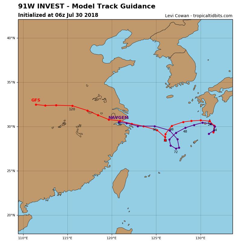 (GFS和NAVGEM预报的“云雀”未来120小时路径)