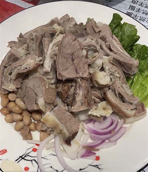 评价:朋友说这家店她早有耳闻,但是一直没来尝过,位置比较偏僻,周围没啥居民区,即使这样生意也很好,饭点都排队了。凉拌羊肉分量给的很多,55元的价格还是挺值的,是用大葱、香菜、蒜片拌的,味道很丰富。羊肉切的很薄,嚼起来一点也不费劲。