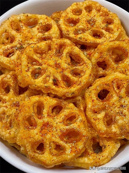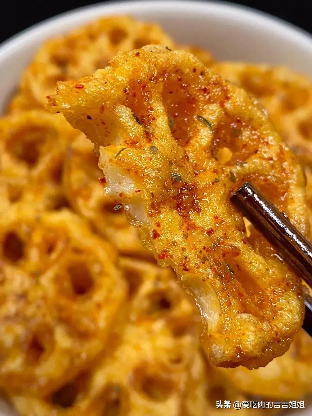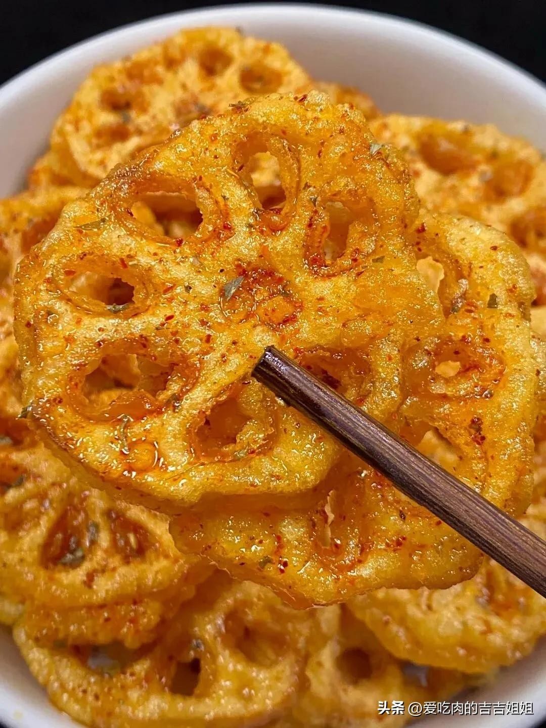 外酥里嫩,香辣酥脆,撒点椒盐和辣椒粉,每一口下去都嘎嘎香,藕香四溢,香香脆脆,追剧时要来上一盘,好吃到停不下来了!
