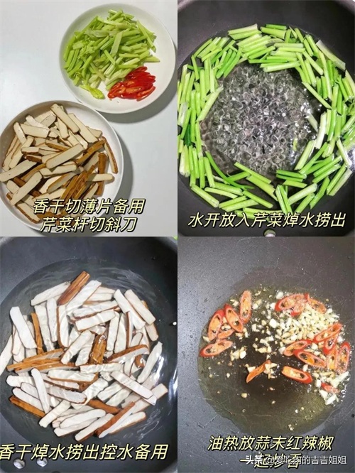 香干切薄片备用,芹菜辣椒切斜刀备用锅中水烧开,放芹菜焯水一会捞出,再放入香干也焯水捞出控水备用锅中热油,放入蒜末红辣椒炒香,倒入芹菜一起翻炒,再放入香干翻炒放入适量盐和生抽,少许鸡精,一起翻炒均匀出锅即可。