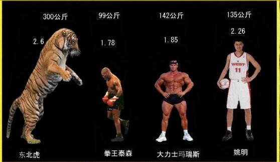 也就是说,如果东北虎站立起来,它甚至比篮球巨星姚明还要高上一些,虽然高度上差不多但是力量上,东北虎却要比姚明强太多了。