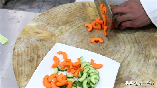 2.黄瓜切成两半,挖去中间的心,切成虾仁大小的块,切出来的块呈弯曲状,和虾仁一样,胡萝卜削去外皮,和黄瓜的改刀方法是一样的,切出来的块儿都呈弯曲状。