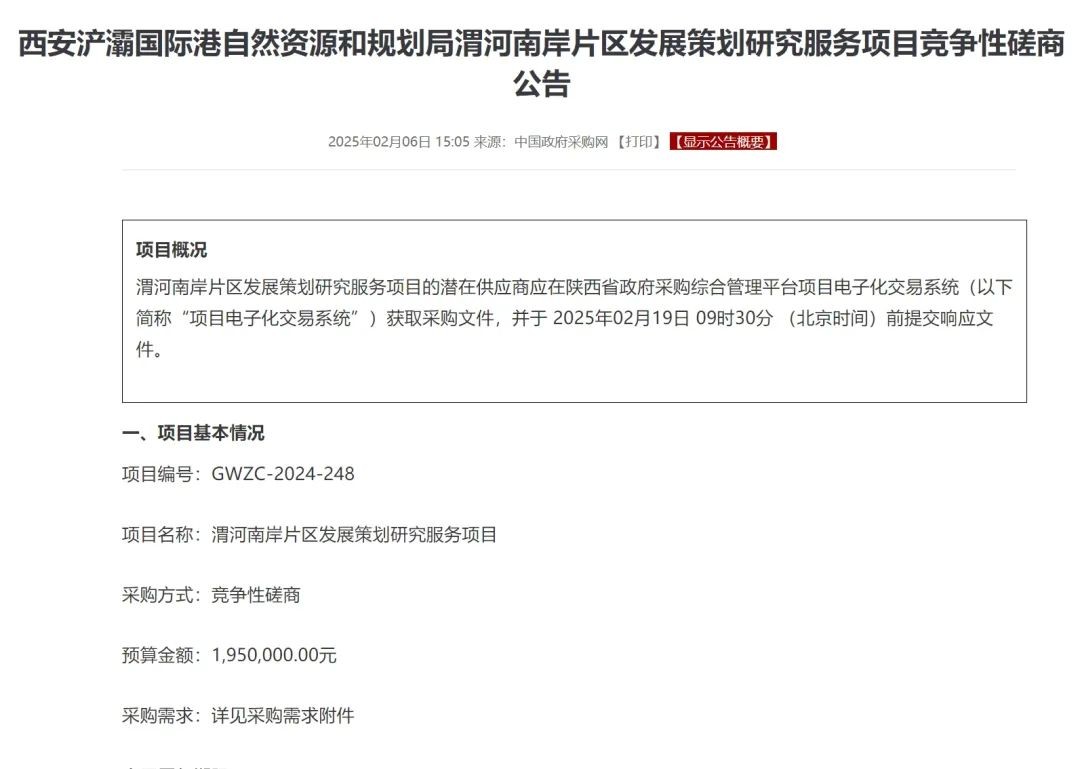 2月6日,《西安浐灞国际港自然资源和规划局渭河南岸片区发展策划研究服务项目竞争性磋商公告》发布。