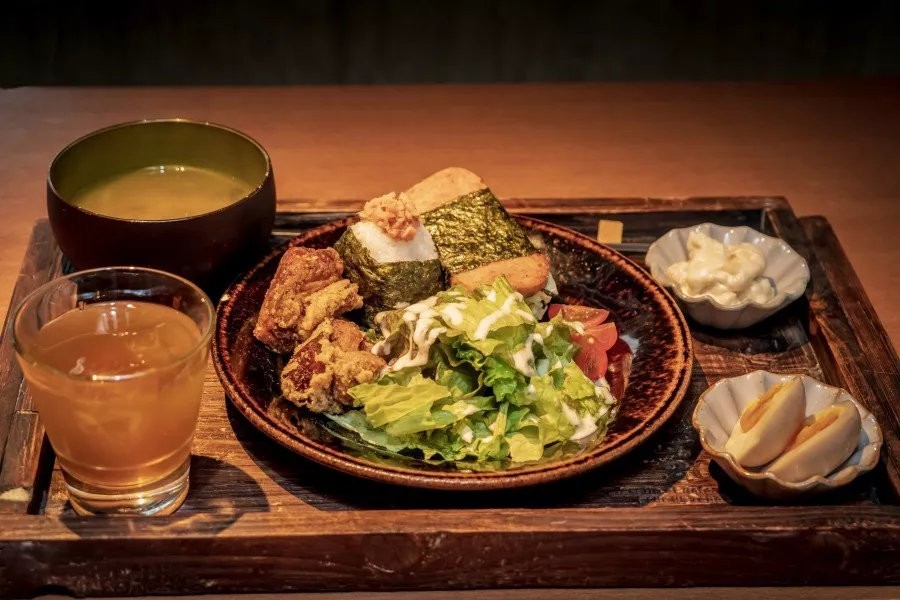 11点~15点的午餐时间段,能尝到名厨SHIORI策划的“KIKKA套餐”(1,020日元)。套餐里有炸鸡块、蔬菜、水煮蛋、土豆沙拉、味增汤和2个饭团(普通饭团和独家饭团)。