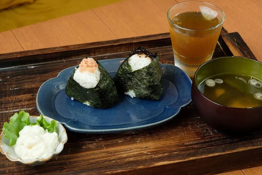 早晨起床后,点了份早餐的“饭团套餐”(7点30分~ 11点供应)。花500日元能选2种饭团,太划算了!哪怕是平时不吃早饭的妹子,也忍不住要尝尝~
