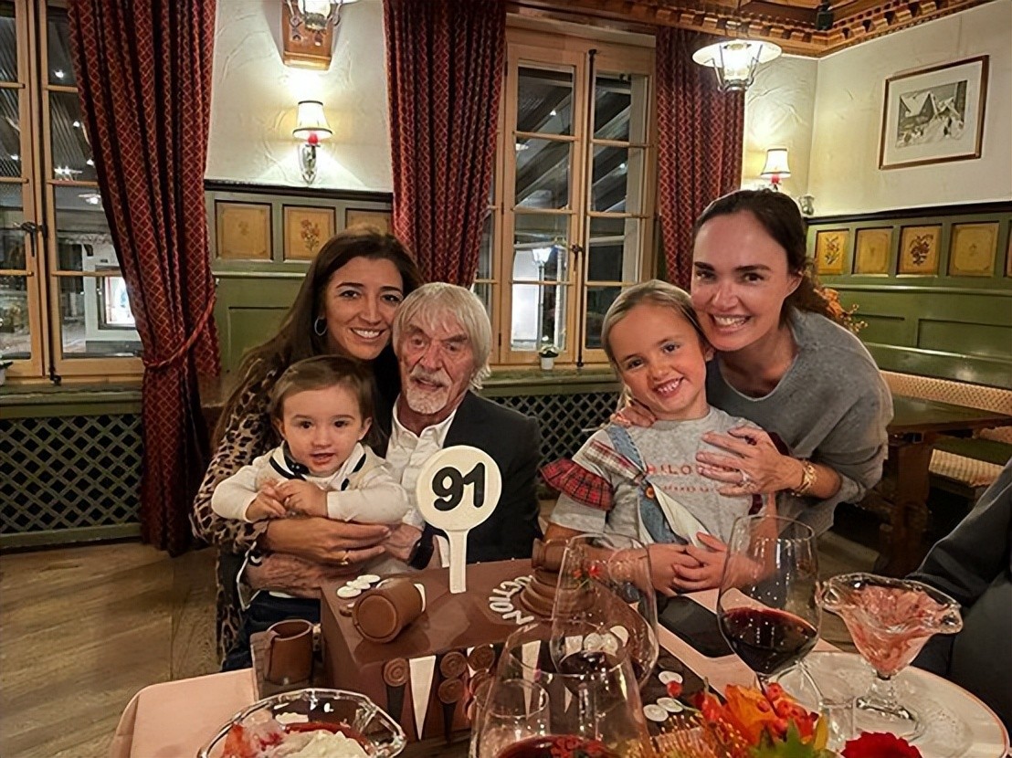 2021年10月,前F1赛车帝国总裁伯尼·埃克莱斯顿,和自己的三婚小娇妻、女儿、以及老来子一起过了自己的91岁生日。