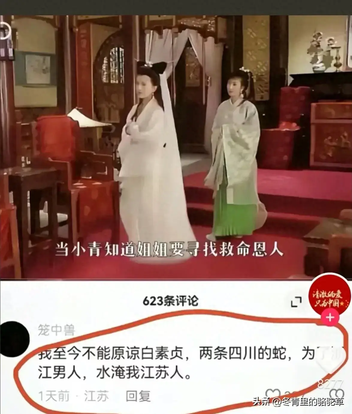 一名江苏网友发文称,我至今不能原谅白素贞,两条四川的蛇,为了浙江男人,水淹我江苏人。