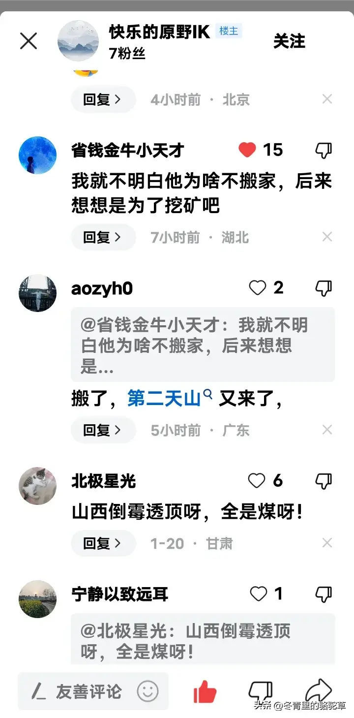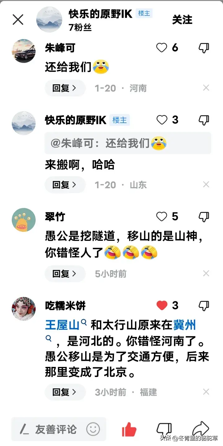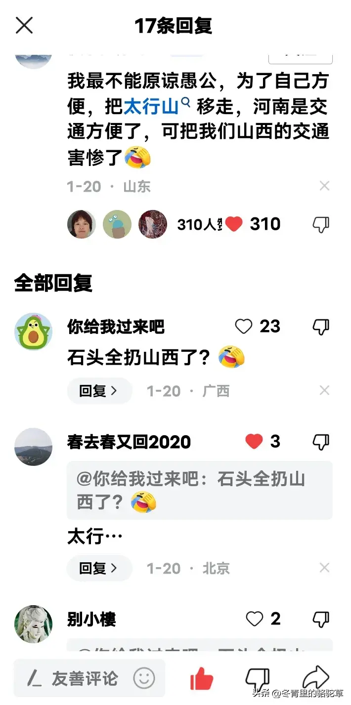 河南网友被点醒立马让山东网友还煤回来,此刻又有善良的网友出来和稀泥,说王屋和太行原来在冀州是河北的不是河南的,愚公移山的地方后来成了北京,山西人错怪河南人了,意思就是都别再争了,免的伤了和气,要算账就去找北京人[捂脸][捂脸][捂脸]