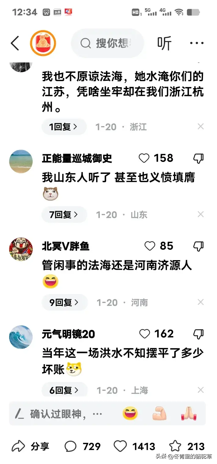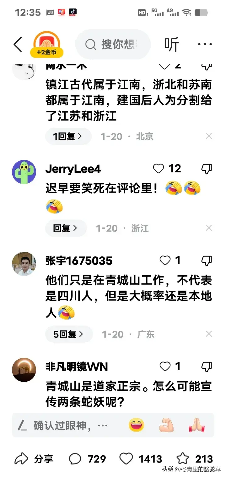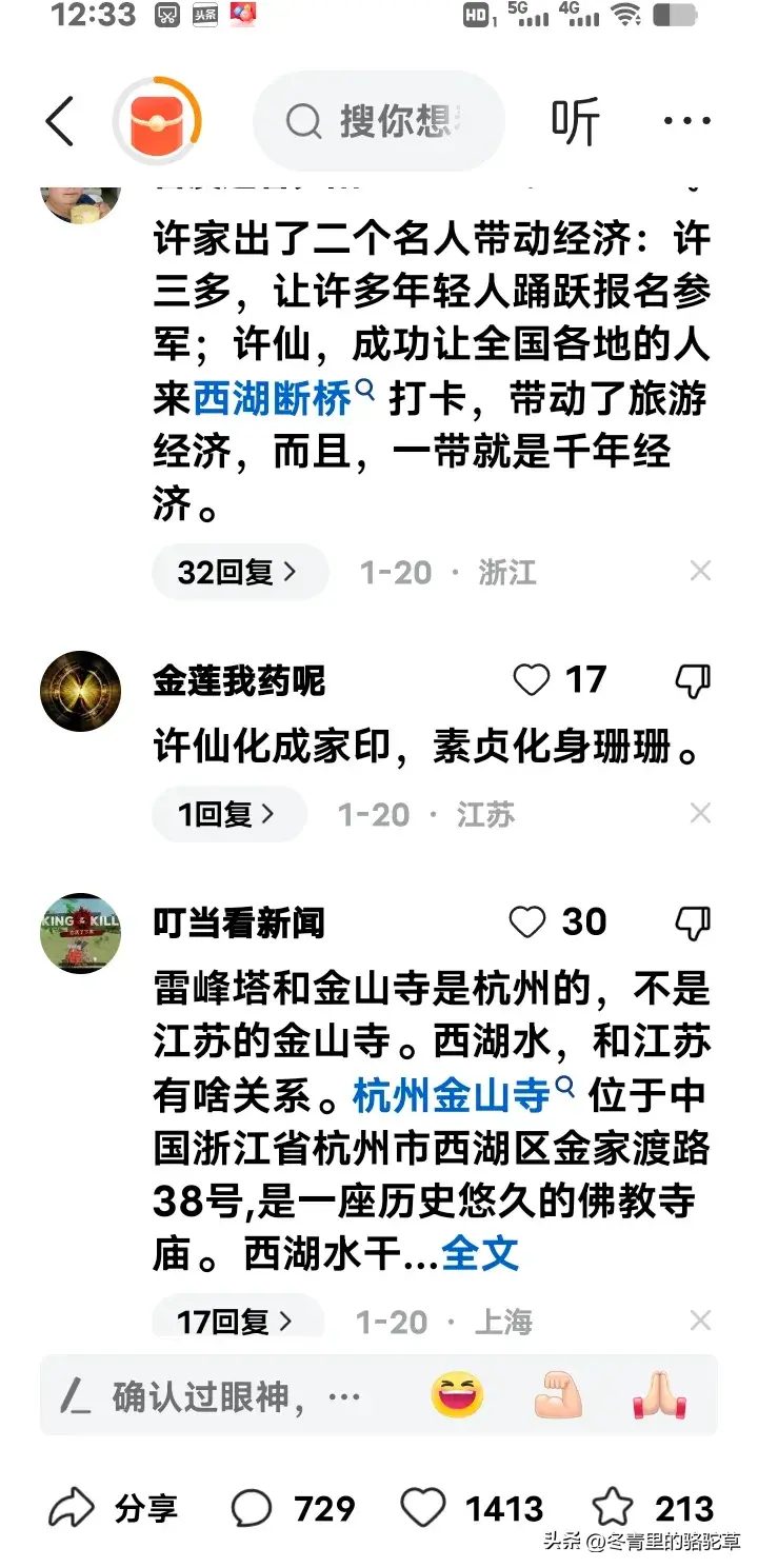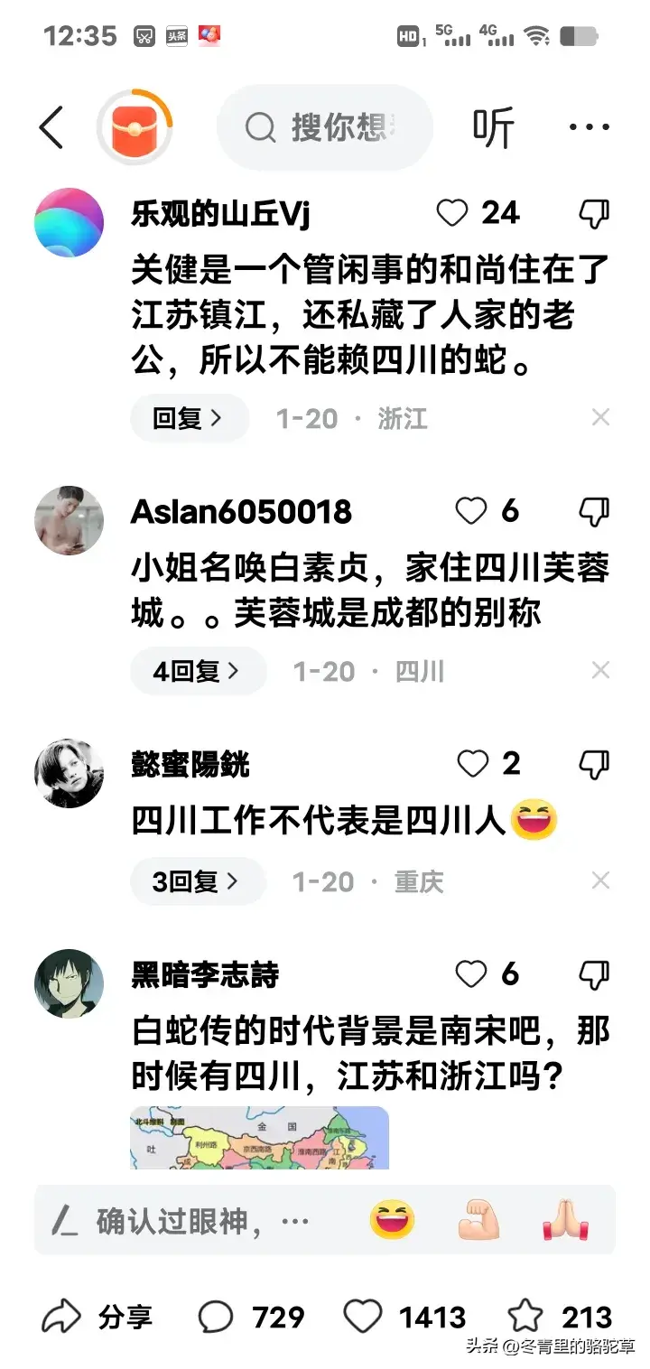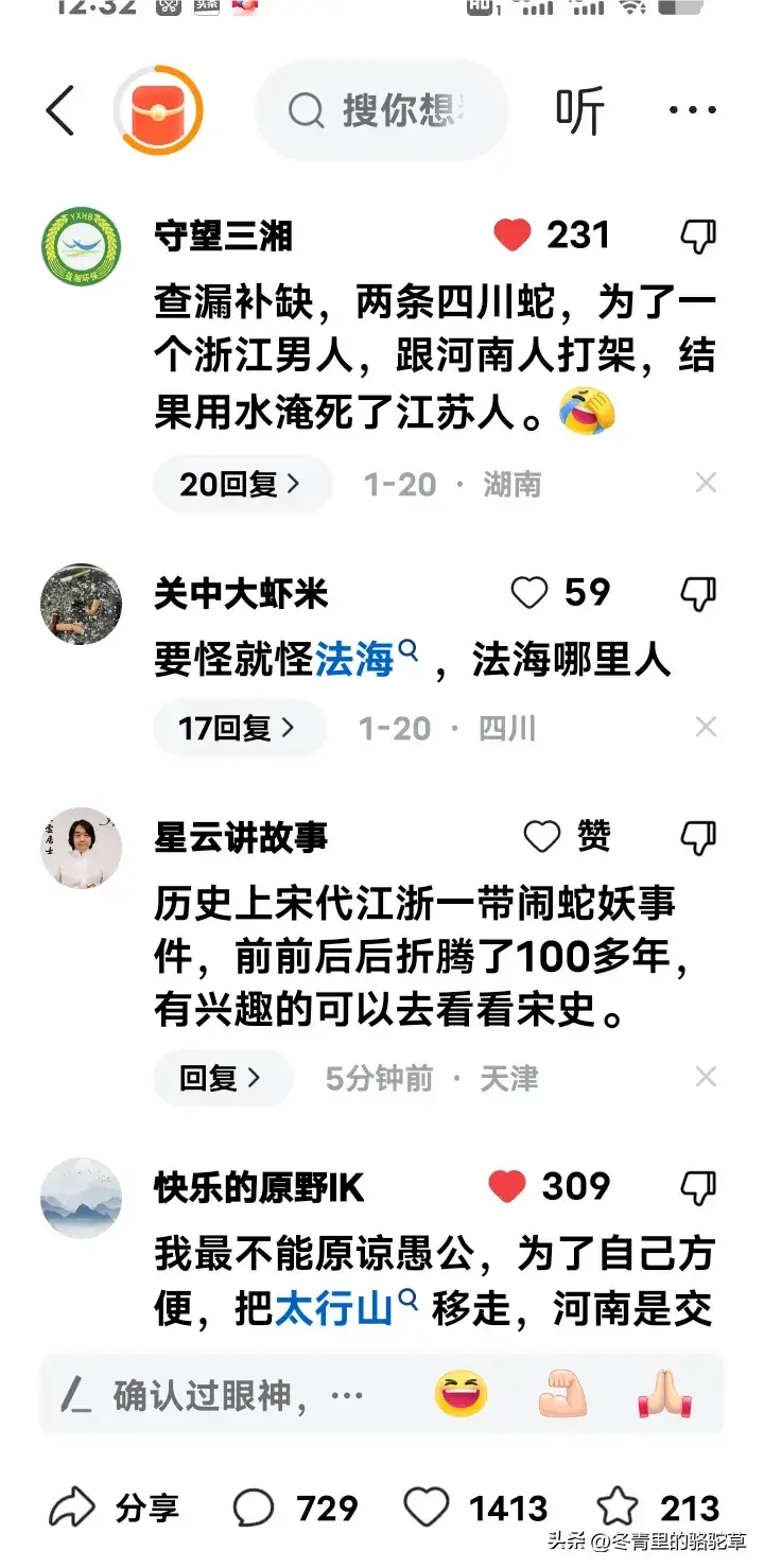 下面这几条评论的知识点就丰富多了,网友们还是自己看吧。不过我比较赞同的是法海绑架私藏白蛇的老公,白蛇肯定是要闹事的呀。所以江苏人要怨就怨由河南人变成浙江人的法海,四川的两条蛇只不过是为了坚贞不渝的爱情,要找回老公才与法海打架引起洪水祸害到你们的,因此看在她们一片赤诚痴情的份上,就原谅她们吧[捂脸][捂脸][捂脸][捂脸][捂脸][捂脸]