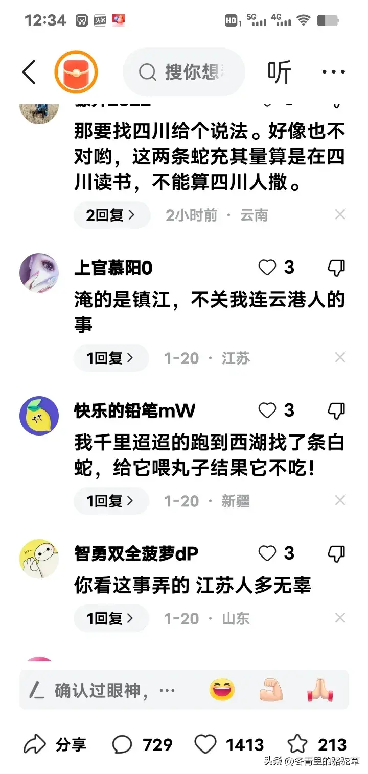 有网友替四川辩解,这两条蛇充其量是在四川读书,不能算是四川人撒。不过这个世界上还是好人多,又有网友安慰江苏人,你看这事弄的,江苏人多无辜[捂脸][捂脸][捂脸][捂脸][捂脸][捂脸]