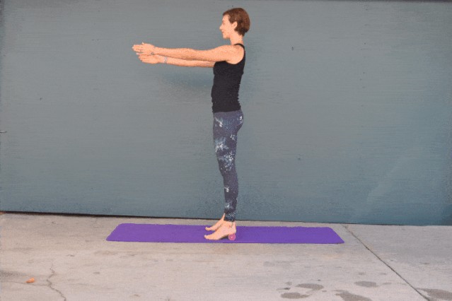 在这儿注意:膝盖不好的或者不能完全下蹲到位的,双脚可以分开的再大一点。或者如图片所示,在脚后跟下垫个小毛巾卷。注意有控制的起和落,使用臀腿力量,而不是撅着臀部用腰的力量代偿。如果感觉吃力,可以直接跳过这个体式,