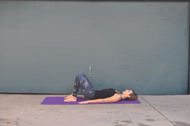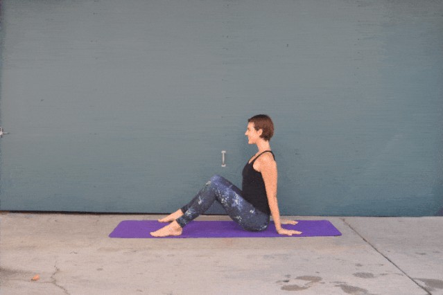 坐在垫子上,坐骨压实地垫双手在臀部后方撑地双脚分开与宽同宽,曲双膝,双脚踩地吸气,延伸脊柱,呼气,双膝倒向身体右侧。吸气回正,呼气反方向。配合呼吸做3~5次。