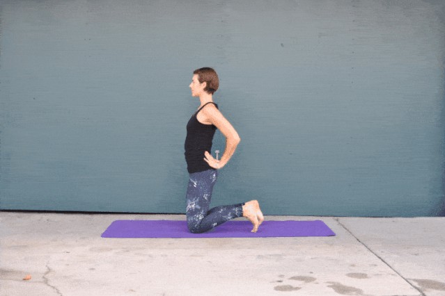 跪立在垫子上,双手扶腰。吸气,脊柱延展胸腔打开。呼气,胸腔上提,双手依次去抓双脚脚后跟。保持3~5组呼吸后回正。