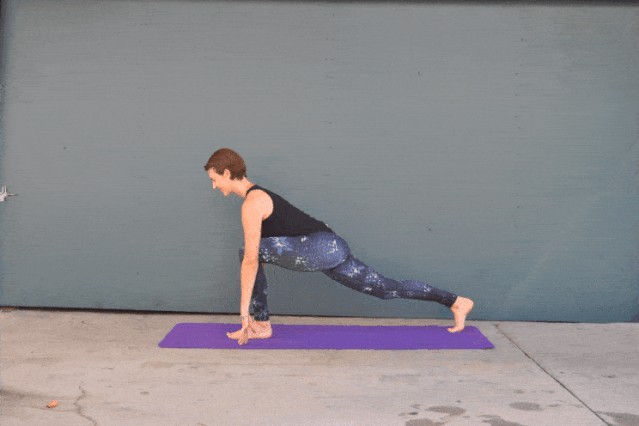 山式站在垫子的前端,双脚分开与骨盆同宽撤右脚向后一大步,脚掌踩地弯曲左膝,双手放左脚两侧,左小腿在脚踝正上方。吸气延展,呼气沉髋向下保持3~5组呼吸。