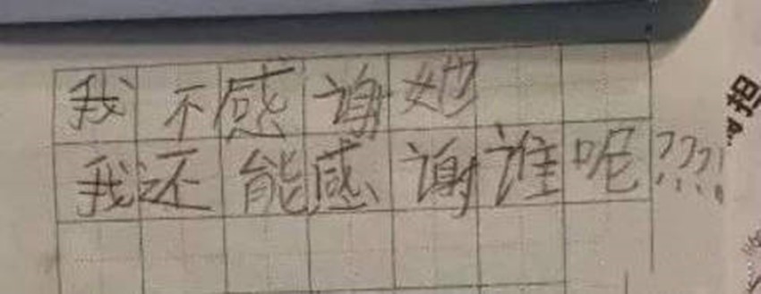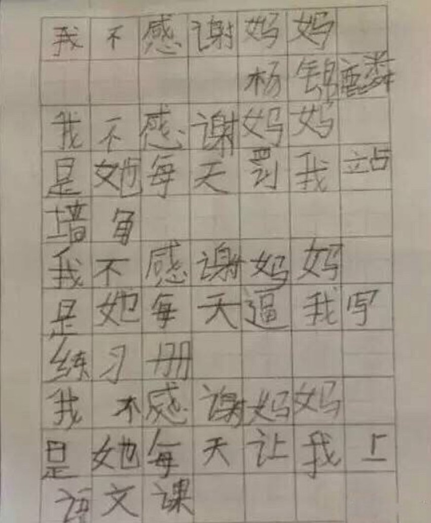 有一个才六岁的男孩写作文的时候是这样写的:“我不感谢妈妈,是她每天罚我站墙角;